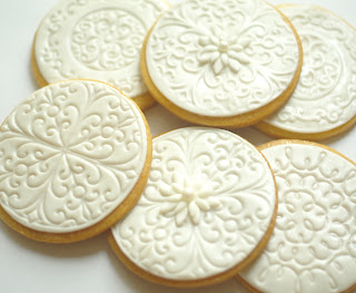 Ciasteczka - medaliony ubrane w pastelowe barwy mogą stać się dekoracją słodkiego stołu na uroczystościach takich jak ślub, Chrzest św., czy Komunia. Ja dla własnych potrzeb wykonałam je w bieli, natomiast pięknie i elegancko prezentowałyby się np. z pudrowo-różowym, wrzosowym lub błękitnym kwiatkiem pośrodku.